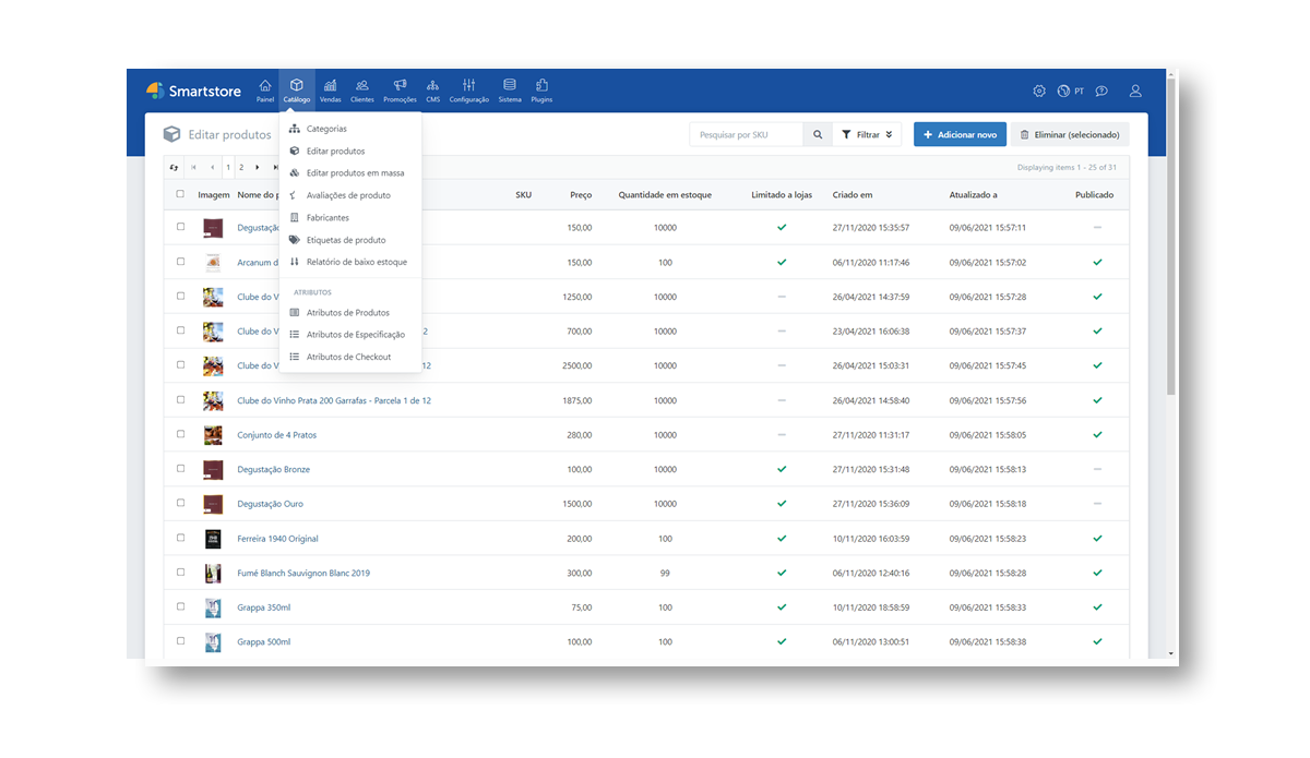 Categorias, Gerencia de Produtos, Editar Produtos em Massa, Avaliações de Produtos, Fabricantes, Etiquetas de Produtos, Relatórios de Estoque Mínimo, Atributos